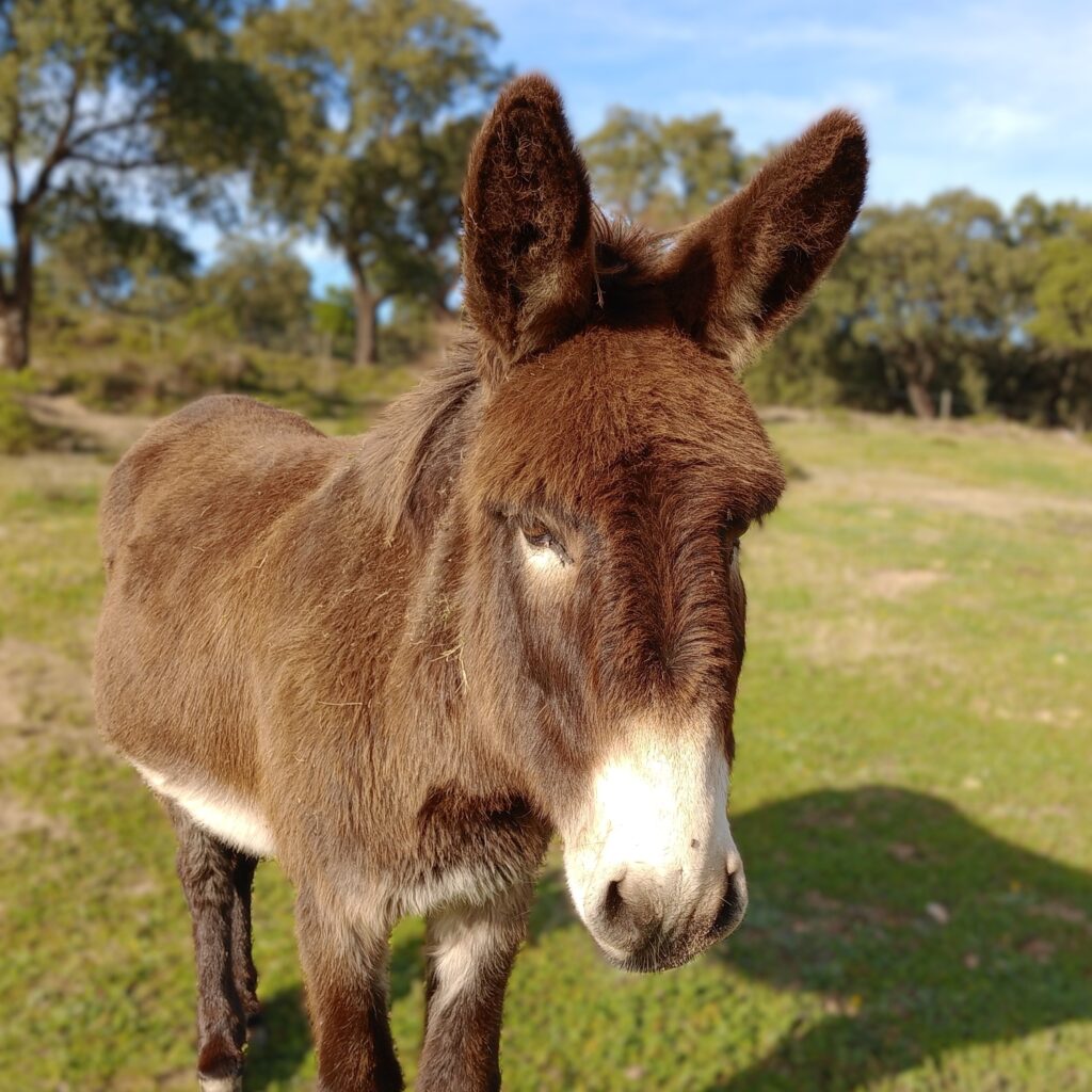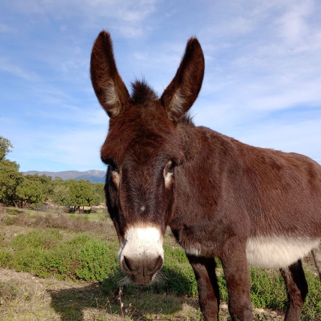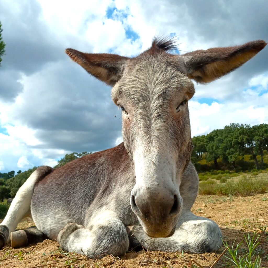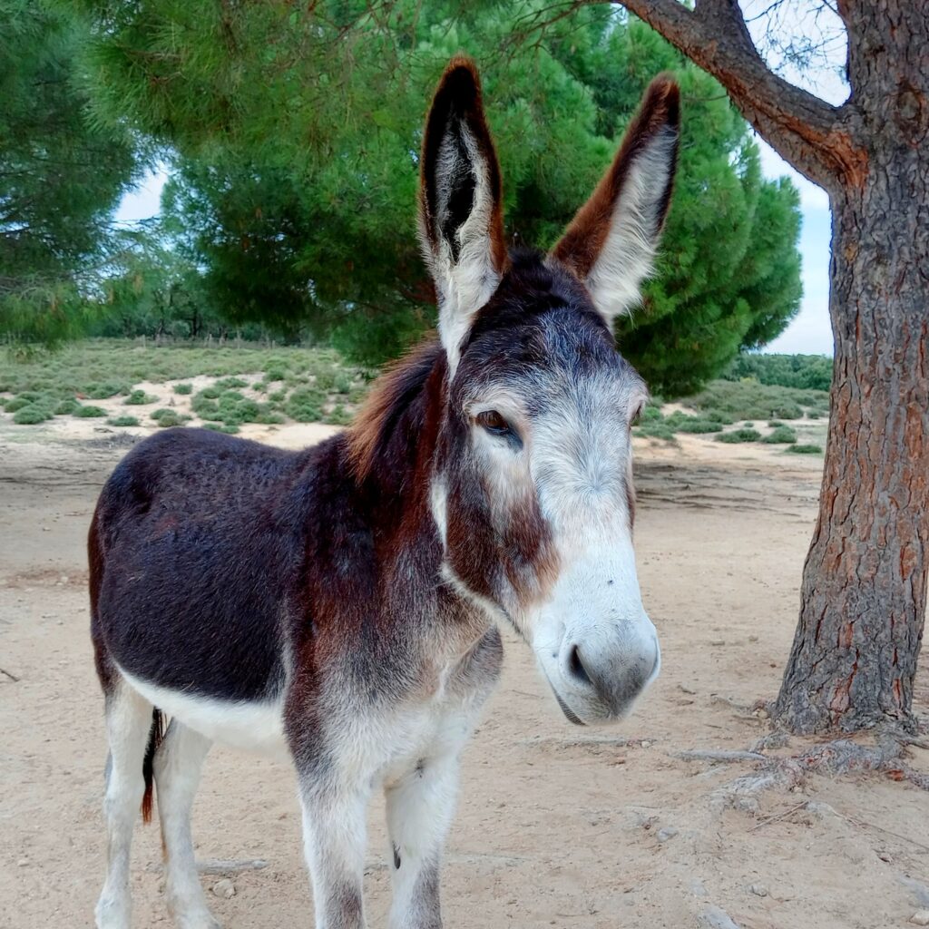 • Diversity: Worldwide there are around 180 donkey breeds, though many are simply regional variations. In Spain alone, seven breeds are officially recognized, including the Catalan, Poitou, and Andalusian donkey. Donkeys vary in size from miniature (about 1 m tall) to large breeds (up to 1.60 m). Their coats can be white, gray, brown, black, or spotted. A typical feature is the dark stripe along their back and the shoulder cross (St. Andrew’s cross).