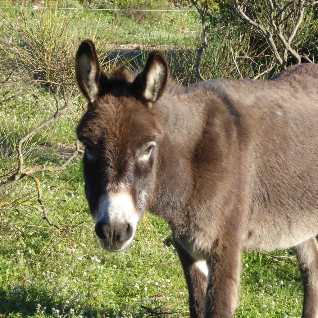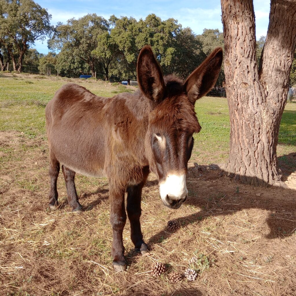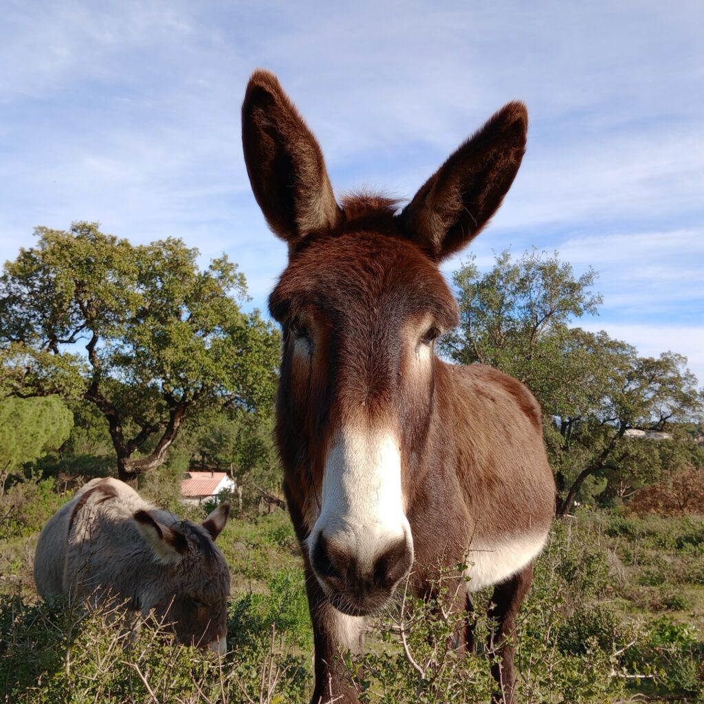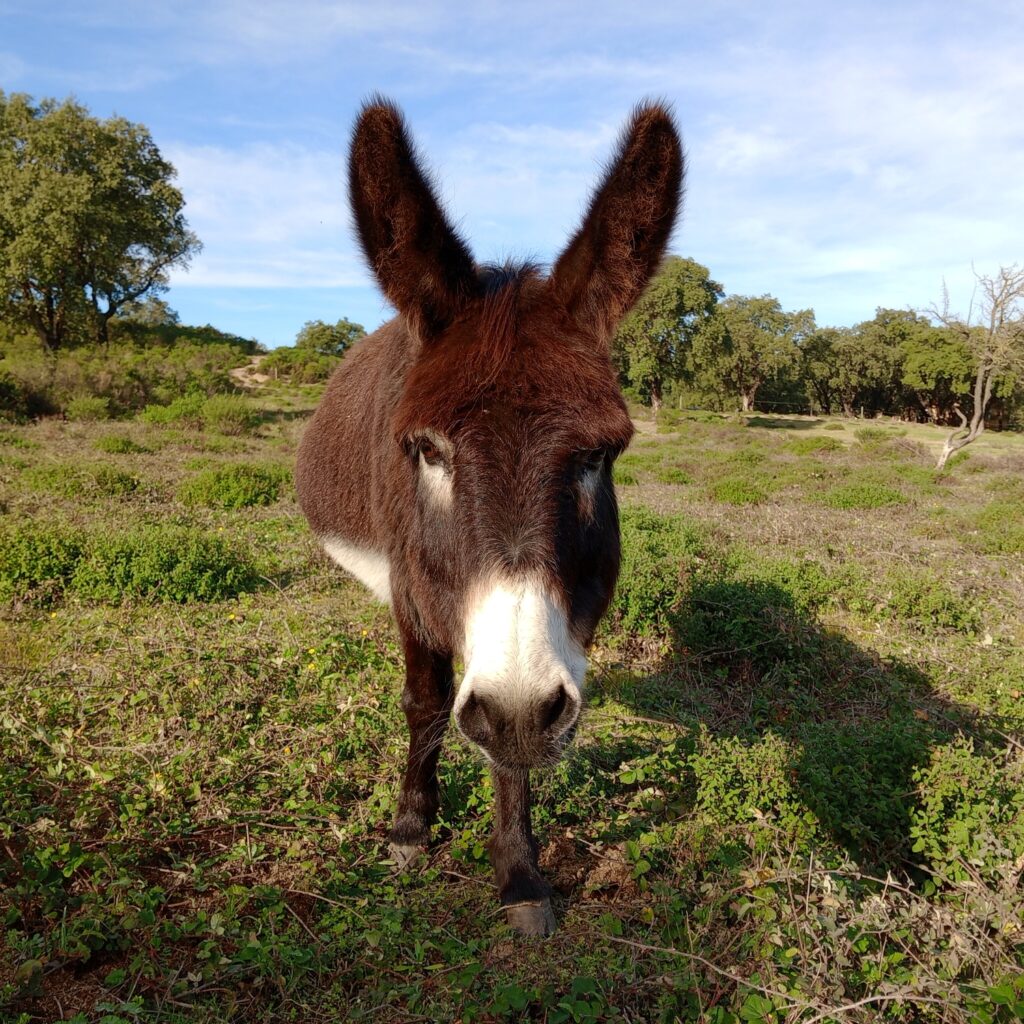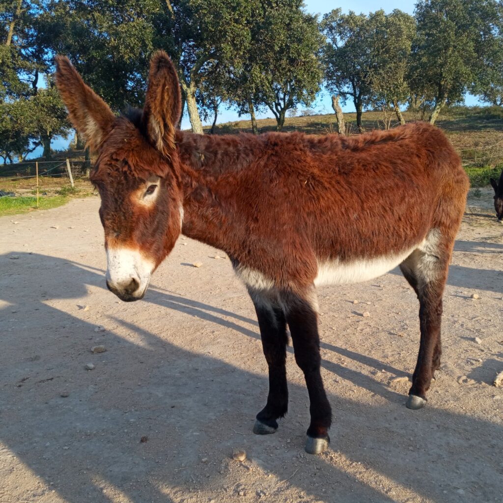 • Diversity: Worldwide there are around 180 donkey breeds, though many are simply regional variations. In Spain alone, seven breeds are officially recognized, including the Catalan, Poitou, and Andalusian donkey. Donkeys vary in size from miniature (about 1 m tall) to large breeds (up to 1.60 m). Their coats can be white, gray, brown, black, or spotted. A typical feature is the dark stripe along their back and the shoulder cross (St. Andrew’s cross).