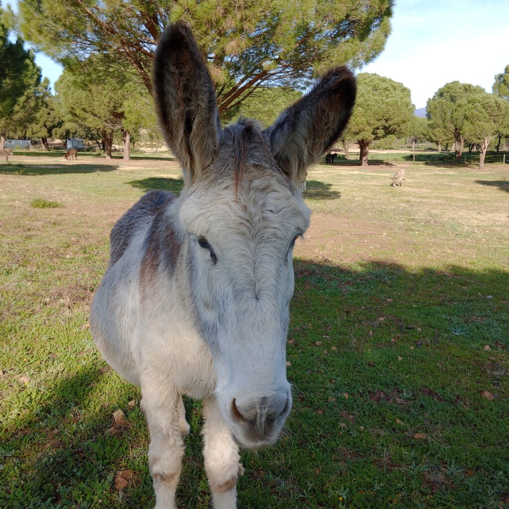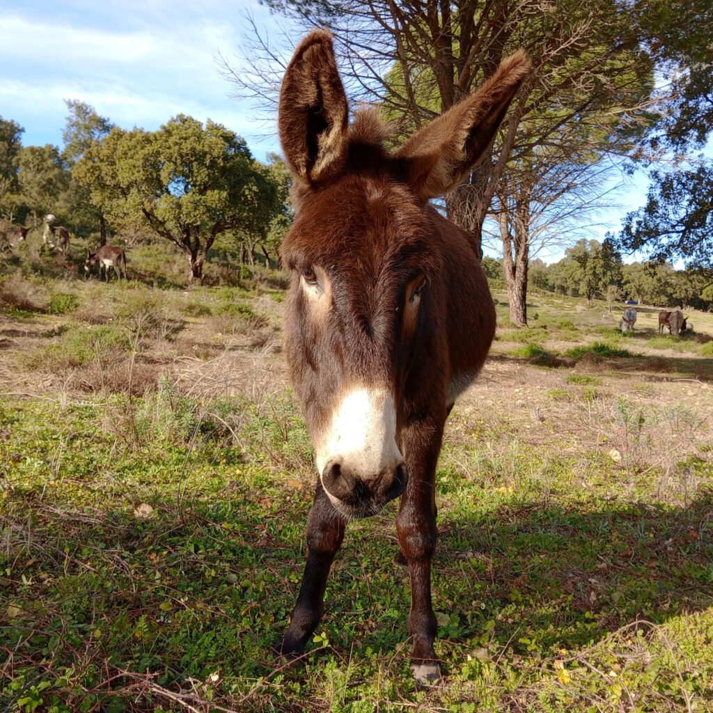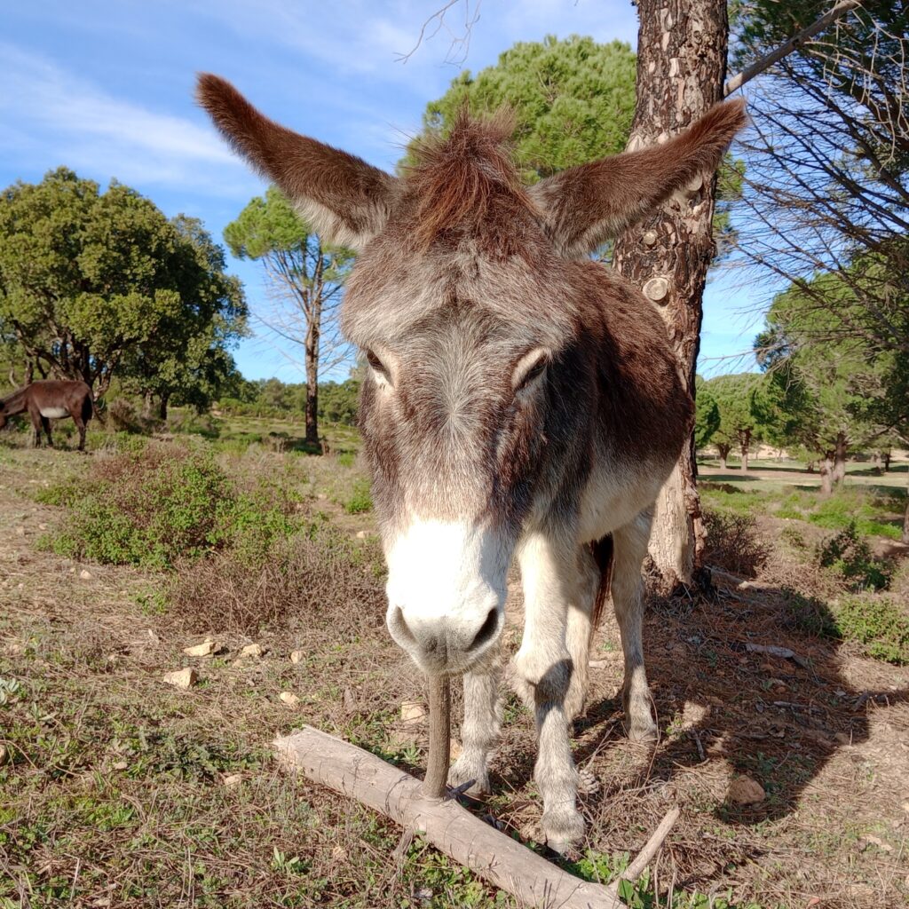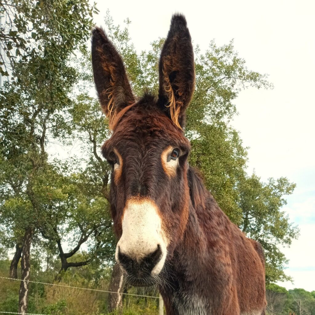 • Diversity: Worldwide there are around 180 donkey breeds, though many are simply regional variations. In Spain alone, seven breeds are officially recognized, including the Catalan, Poitou, and Andalusian donkey. Donkeys vary in size from miniature (about 1 m tall) to large breeds (up to 1.60 m). Their coats can be white, gray, brown, black, or spotted. A typical feature is the dark stripe along their back and the shoulder cross (St. Andrew’s cross).